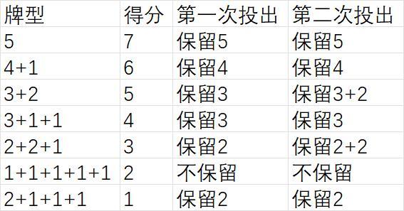 看,如果是第二次投出2+2+1,保留2+2更好,但如果第一次投出2+2+1,就是保留2更好了。第一次和第二次投出3+2时策略的选择也是不一样的。