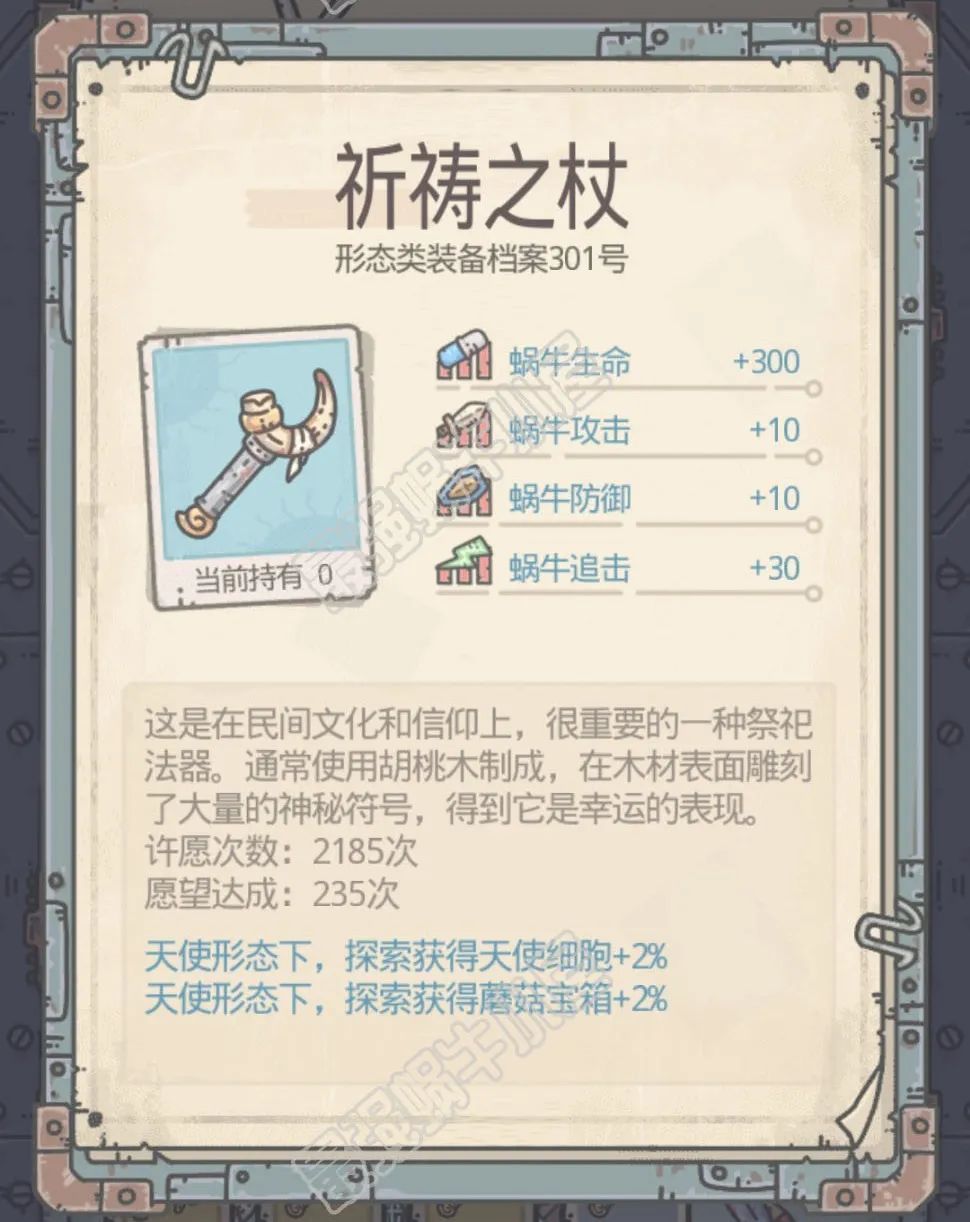 完成后,给天使专属装备——祈祷之杖(初始蓝色),可与莲台合成+1(天使以前是非常顶的,跑图给神赐宝箱,所以这个装备当时基本人手一个)。