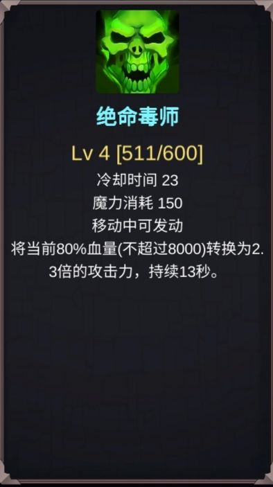 出生可以选择加攻技能(高级时40秒内+80%攻击力,cd60秒,这个是可以和攻击药水按乘法叠加的,所以后期收益很高,常态攻击力1w+,开绝命毒师甚至达到3w+)或者恢复技能(前期很有用,但后期恢复力疲软,不如吸血套+魔石吸收)
