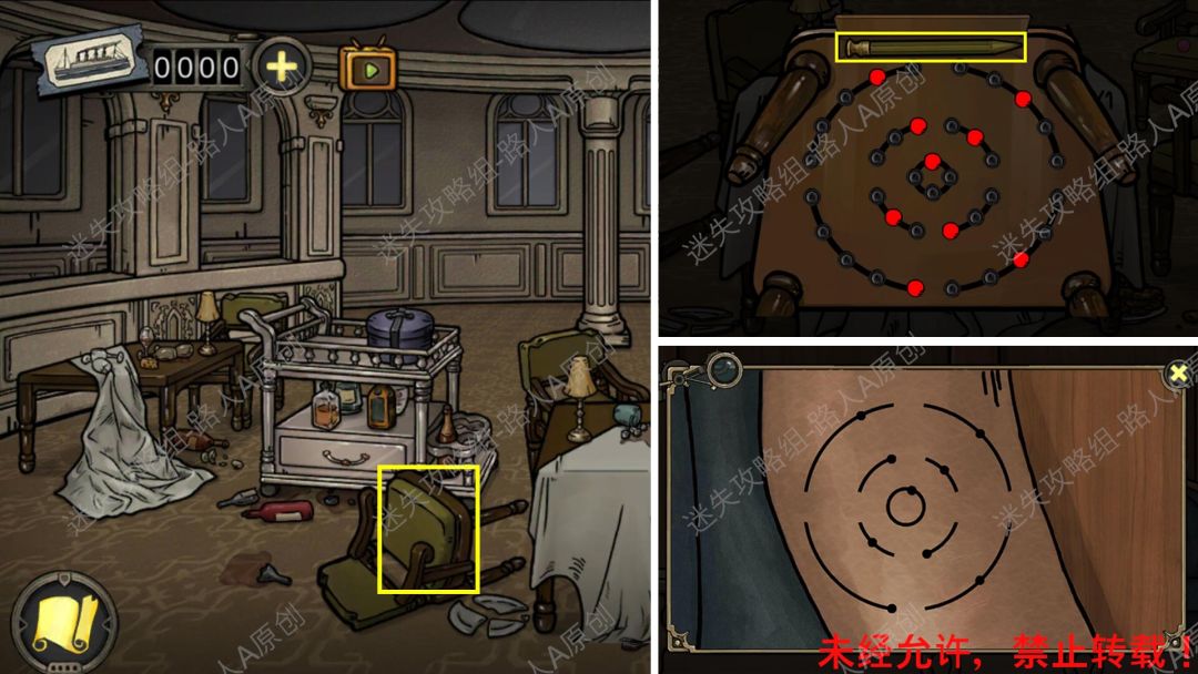7.前往餐厅,查看倒下的椅子底部(先点右边有白色桌布的桌子,再点左边椅子可看到底部),根据线索调整机关,得到【铅笔】。7.1
