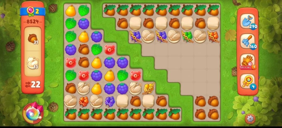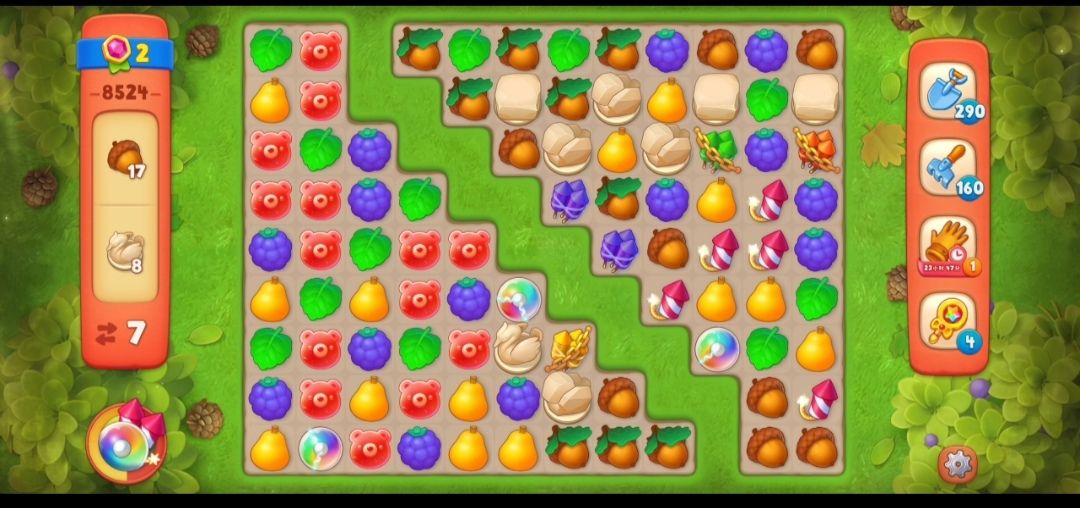 ④这一关的橡实有两种,带叶子的橡实需要先在橡实旁边元素匹配,消除叶子,然后在在没叶子的橡实旁边元素匹配一次,就可以消除。
