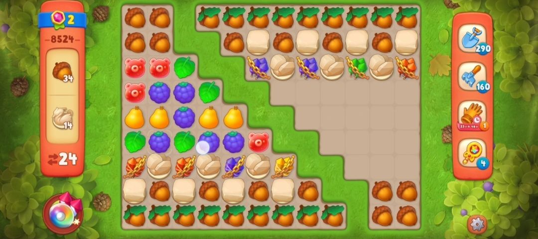 ①先观察一下开局,这一关一共是24步,过关目标是橡实和天鹅雕像。