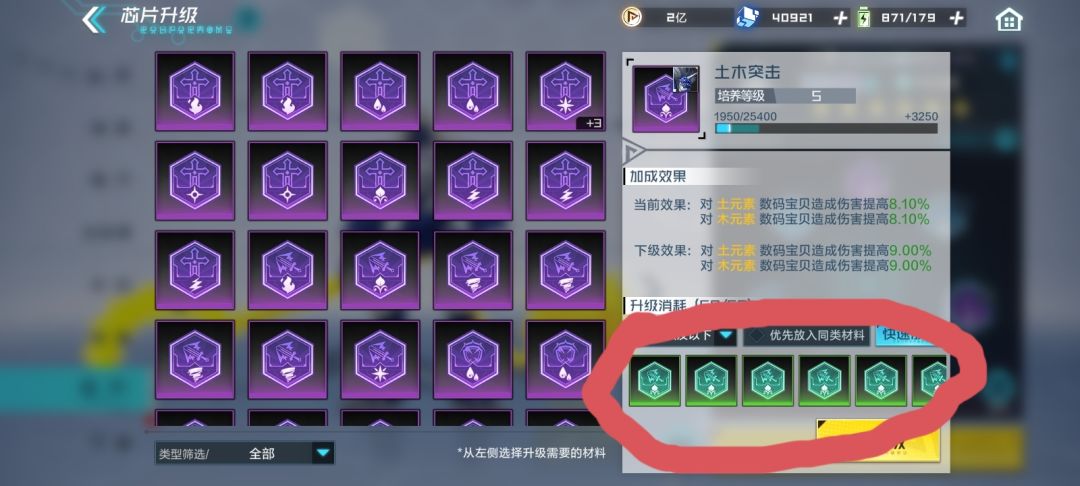 红圈里没有下降箭头的吃了经验高一点,有下降箭头的吃了经验对比少一点。如果有时间可以慢慢一个个试着吃同类型芯片,蚊子再小也是肉嘛。嫌麻烦就不慢慢试,直接狂吃。