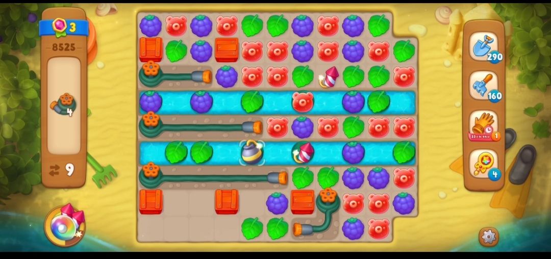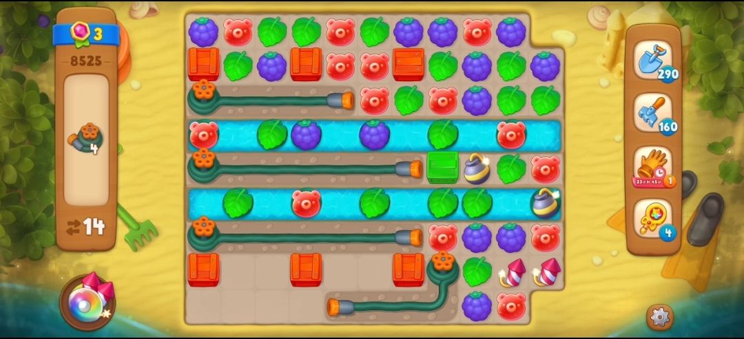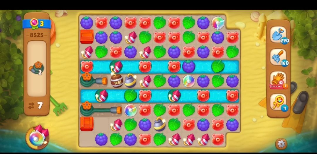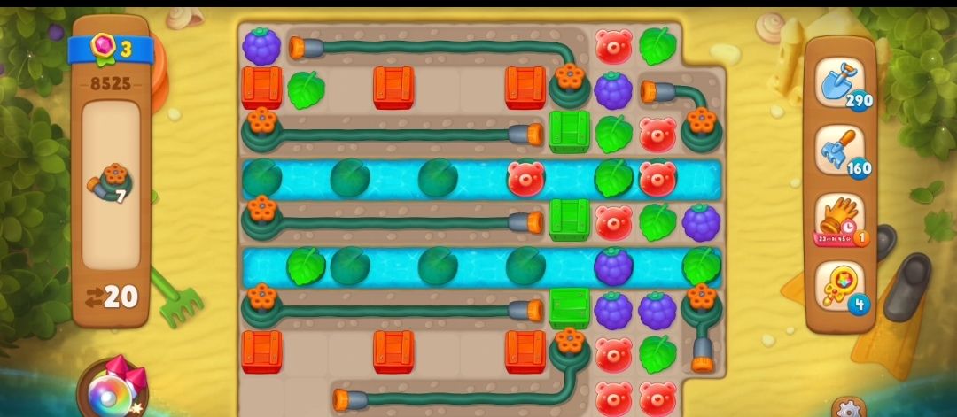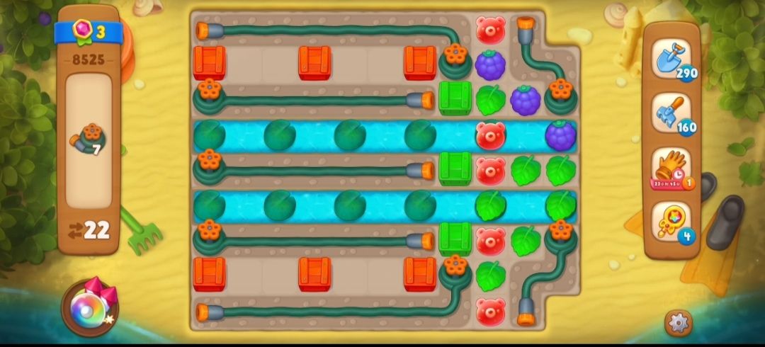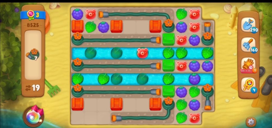 ③消除掉最右边的水管之后,开始消除彩色箱子,是在彩色箱子旁边匹配和箱子颜色相同的元素,这一关的彩色箱子要在彩色箱子旁边两次元素匹配才可以消除。