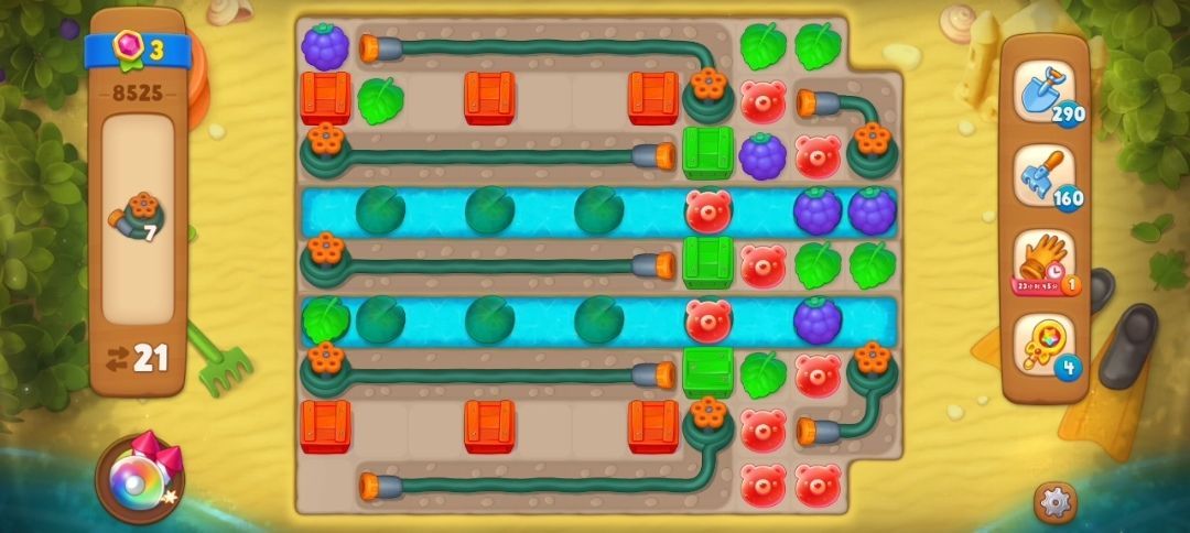 ⑥要了解这一关的过关目标是水管,所以不妨碍水管的彩色箱子可以不用非要消除,尽可能的节省下来步数,毕竟水管是相当浪费步数的。