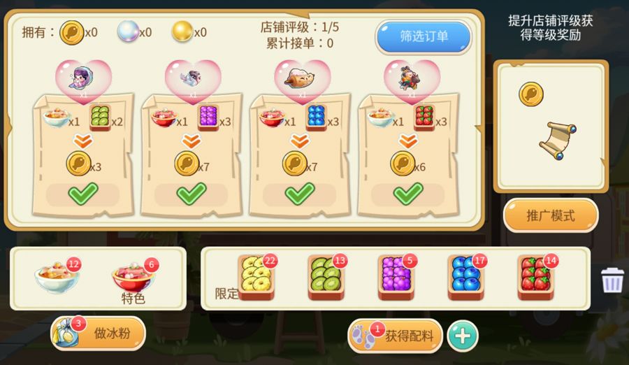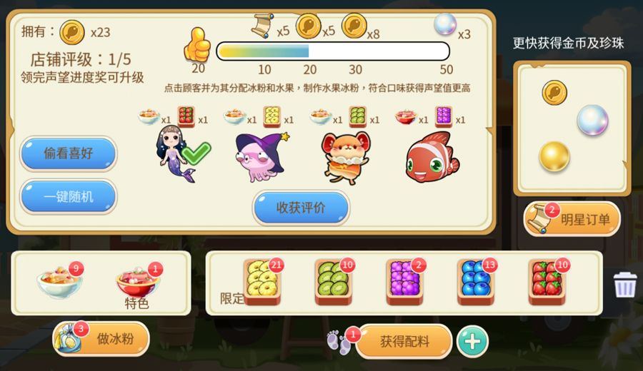 回到小铺首页,开始为顾客分配冰粉和水果配料。