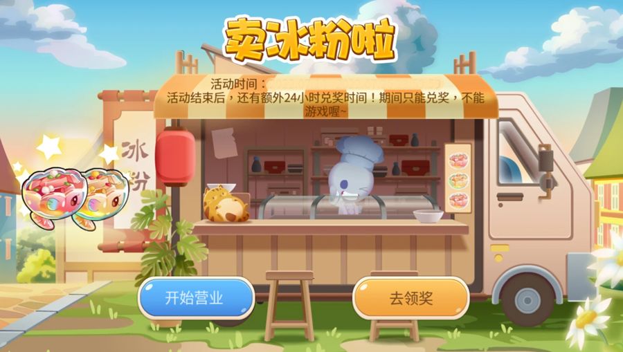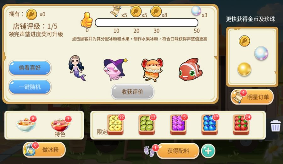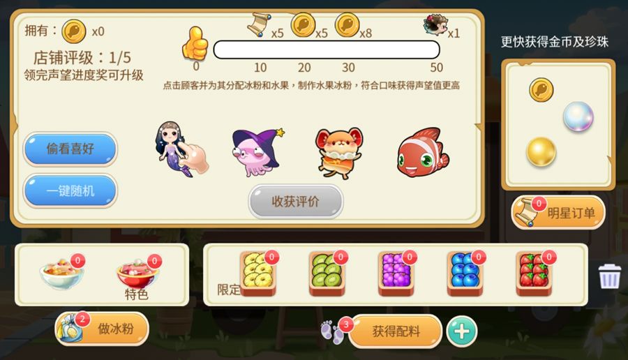进入冰粉小铺开始营业啦~点击<获得配料>先去收集一些水果配料吧~