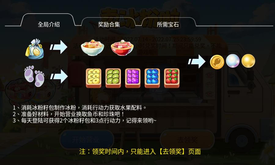 1、本活动分为两部分:开始营业、去领奖;