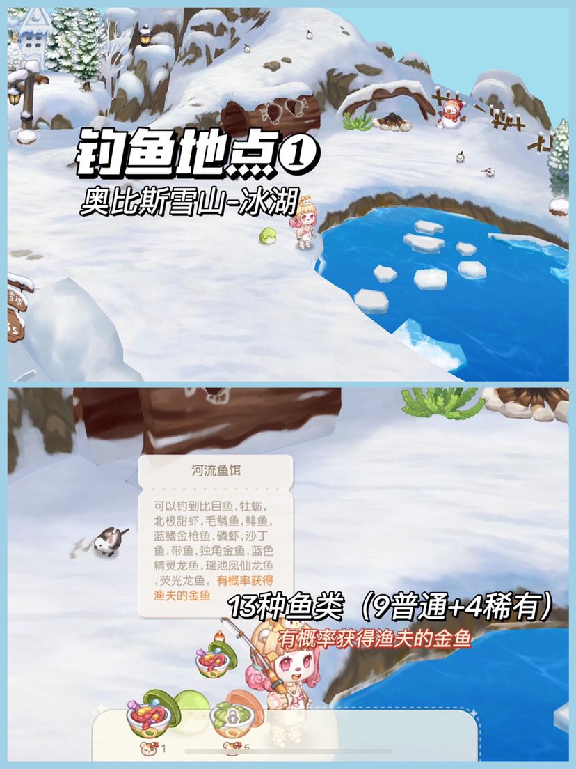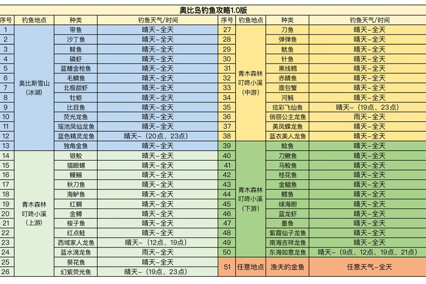 ⚠️51种鱼类(34种普通+16种稀有+1渔夫的金鱼)全图鉴,钓鱼地点/天气/时间整理成列表见图10