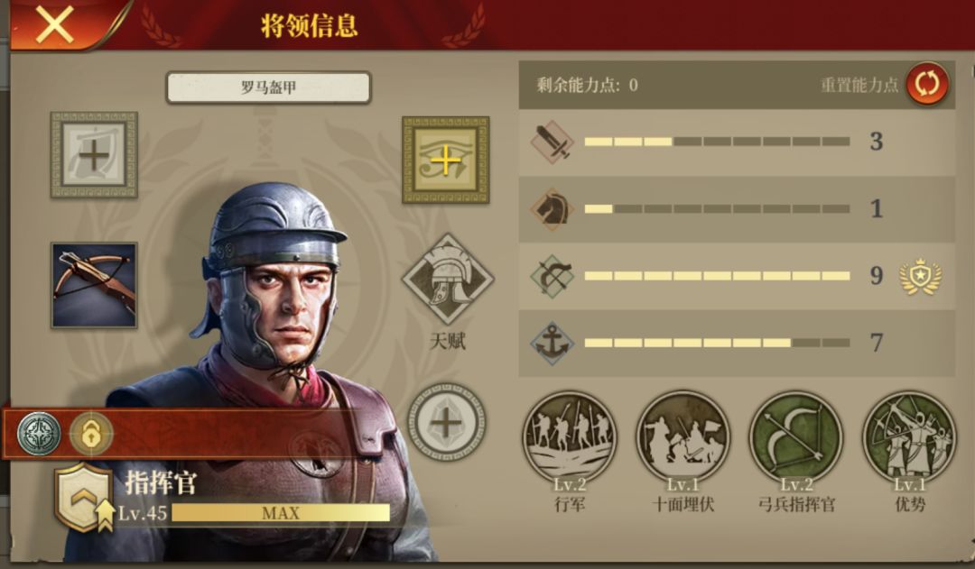 进入正题,进入游戏后首先要考虑指挥官的选择。推荐加点弓,如果选择走弓指可以直接4级能全学,如果希望走骑和步的正常学技能,点弓属性点即可。