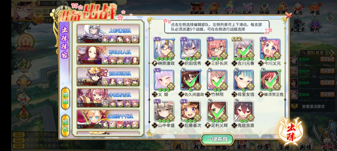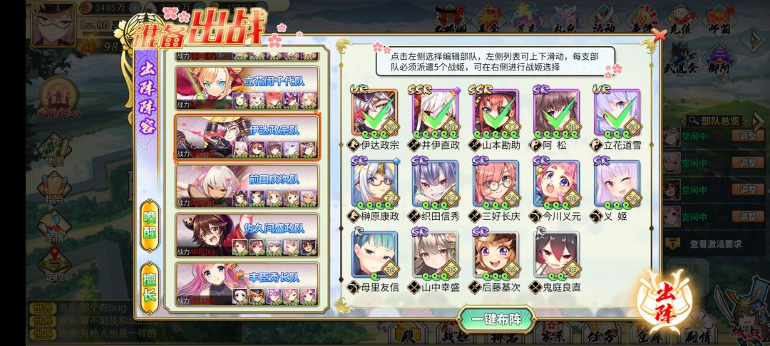 道三,石田,北条,阿松,丰城秀吉。都是比较稳定的奶,姑且称为主奶,可以单独带队。基本就不缺奶的,如果练度不够实在缺奶,就上辅奶,就是被动技能里有奶的,比如夫人,大谷吉继,前井长政。所以五队剿匪是绝对没有问题的,练度起来以后可以把辅奶拿出来另组第六队,第七队。