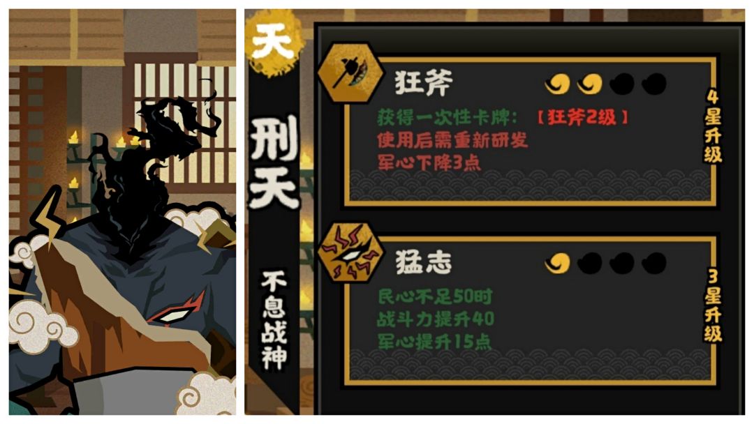 刑天的二技能猛志可以提供70点战力,并且其增加的30军心和孔子的降低腐化一样永久存在,可以防止0军心开局溃逃导致无法到达敌方半场触发只争寸阴的情况,但要求需要低民心,而刑天本身不自带降低民心的机制,所以又需要别的名臣配合