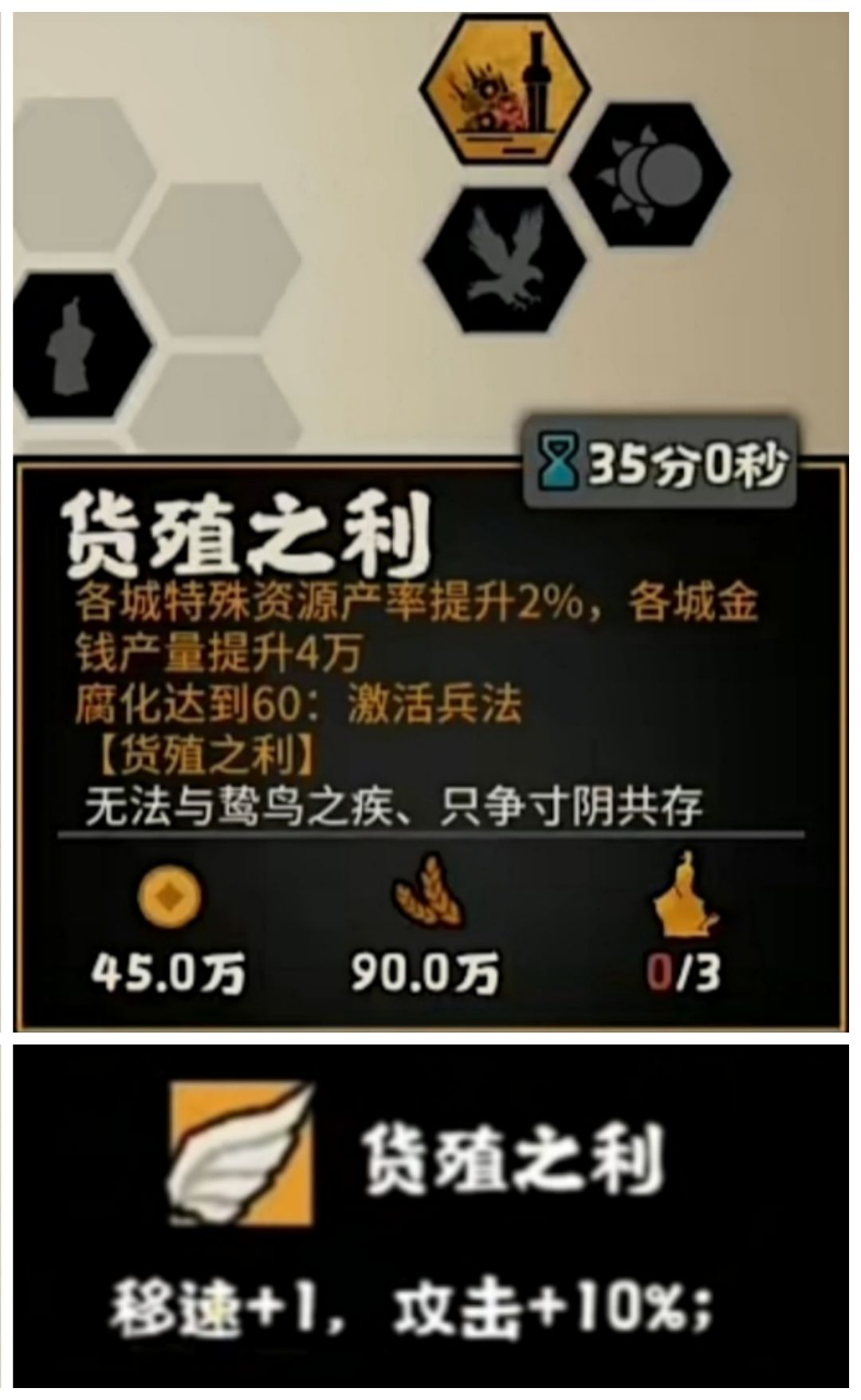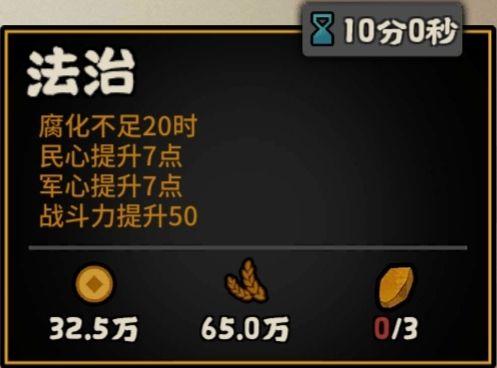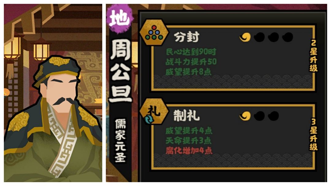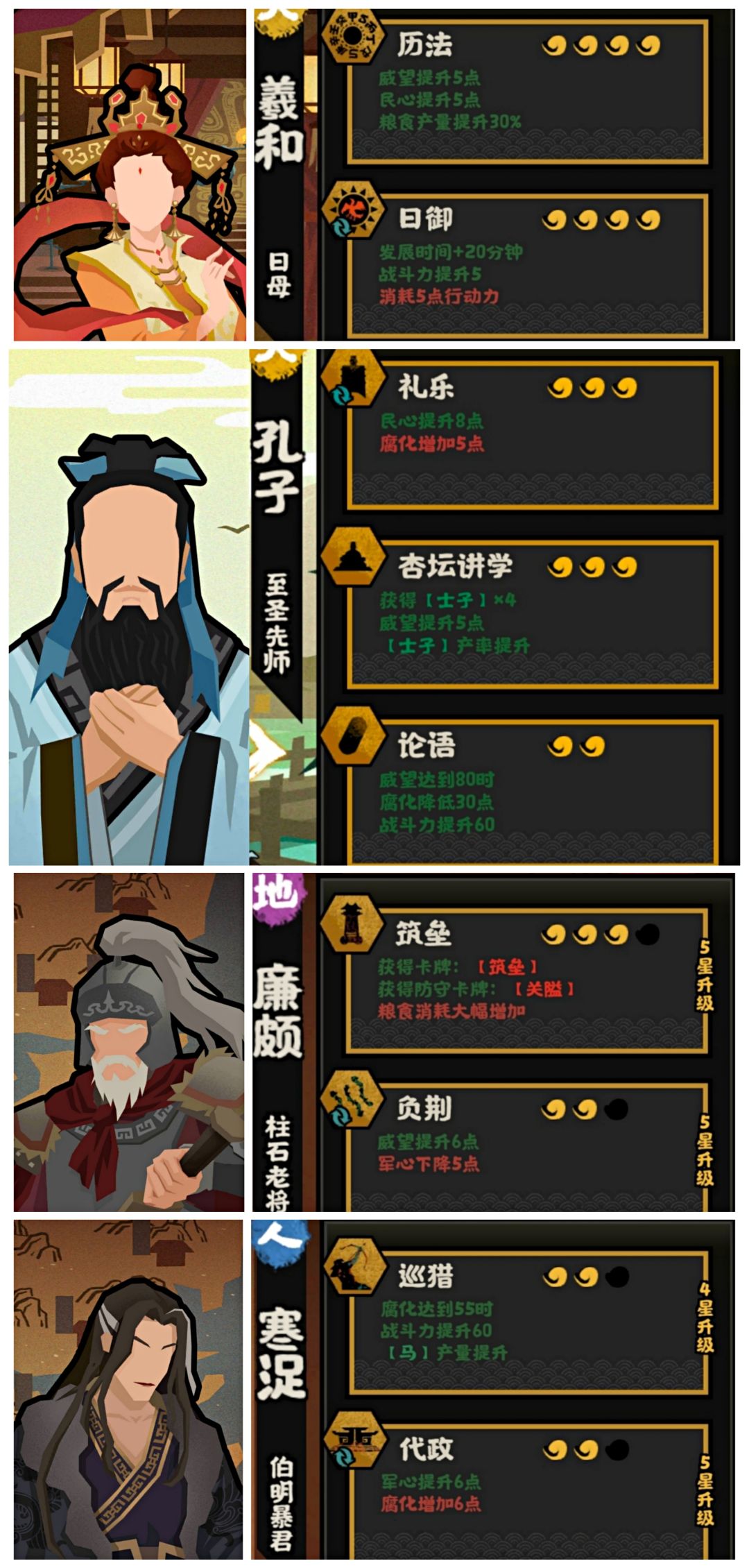 而且孔子的三技能论语即使满级也只减少30腐化上限,搭配一技能礼乐增加腐化及民心非常契合兵法货殖之利需要60腐化解锁的要求