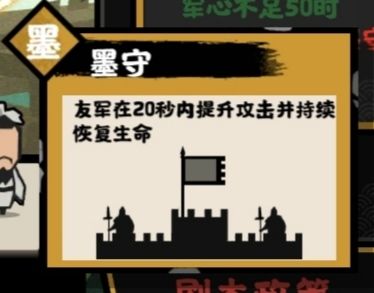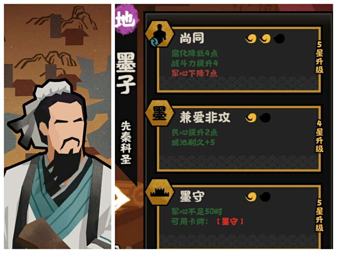 墨子的一技能尚同可以降低军心持续增加战力,三技能墨守提供的卡牌墨守的回血搭配步兵自身的防御属性以及兵法只争寸阴的格挡,有着非常可观的收益