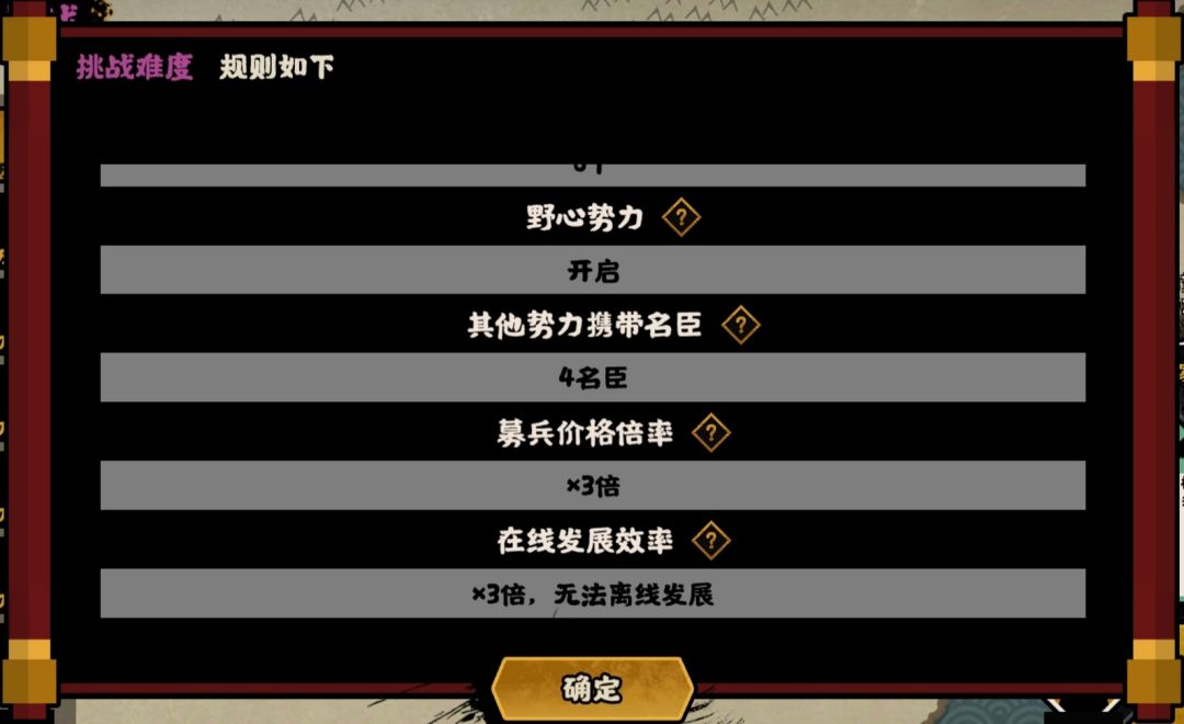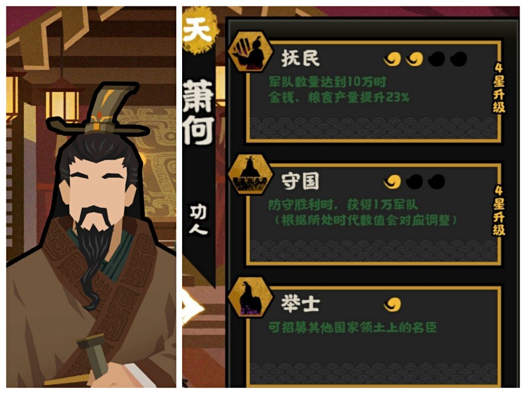 在挑战模式中,AI的侵略性大幅增加,这就使得你只要在侵略性强的AI旁边,你就可以利用萧何的二技能守国无限造兵,这在挑战模式下募兵价格提升的情况下无疑是很好的助力,提供的军队也可以达成一技能抚民的要求提升钱粮产量。