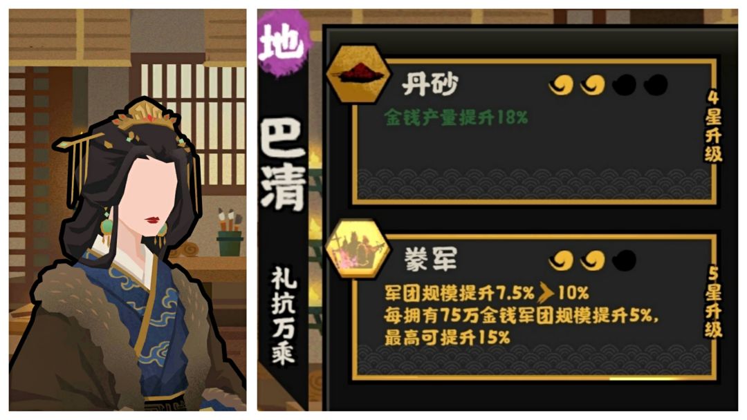 巴清的二技能也可以提供25%的军团规模,且金钱要求由于货殖之利增加的金钱产量变得十分容易达成。