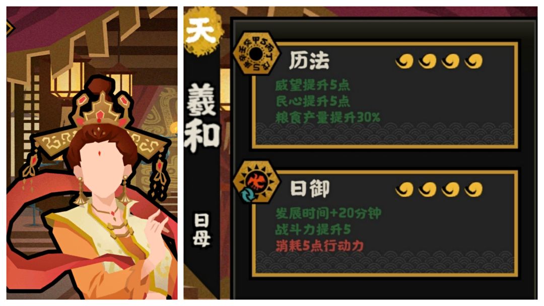 至于民生位置为什么是羲和,这是因为其他三个名臣都不提供资源,且又是腐化流,腐化本身就会增加资源消耗,如果民生位置还使用如娥皇女英等不增加资源的名臣,就会导致在某一时间资源短缺,白白挂机等资源浪费时间(以上是不使用道具的情况下)所以需要借助羲和二技能日御的增加发展时间来提供资源