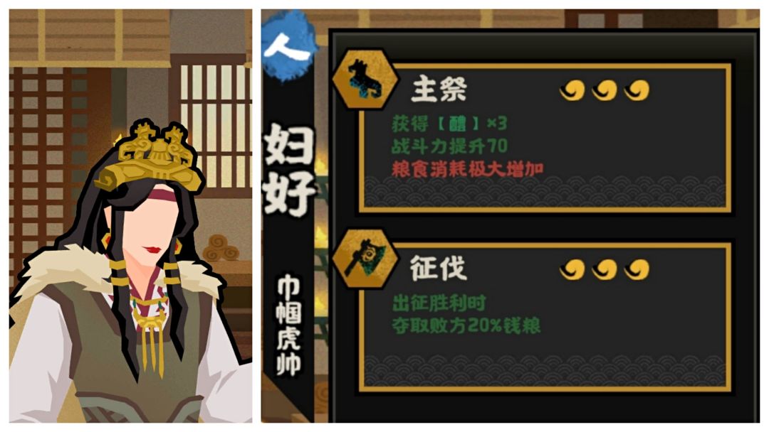 妇好在之前挑战模式未出时就备受欢迎,在如今也有着强者的一席,不过要注意,妇好的一技能性价比不高所以不建议点,这时候就需要配给增加作战能力的名臣,而在自身掠夺机制的影响下,民生位就不需要羲和来补足资源漏洞,可以使用娥皇女英、巴清来进行替换