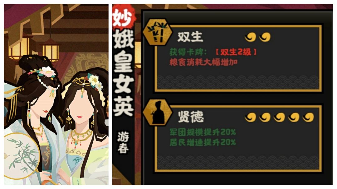 娥皇女英二技能贤德可以无要求的增加20%军团规模,且一技能双生提供的双生卡牌配合吴国国家的卡牌可谓是神挡杀神佛挡杀佛