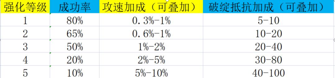 下面附上全等级强化可以获得的属性加成和成功率。
