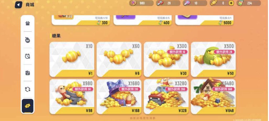 首先,打开游戏,打开商城,打到糖果界面,不能点1元和6元的,如果点了,就白嫖不到糖果了!如果点30元,会白嫖到16个糖果,如果点50元,会白嫖到28个糖果,如果点98元,会白嫖到58个糖果,如果点168元,会白嫖到118个糖果,如果点328元,会白嫖到268个糖果,如果点648元,会白嫖到568个糖果。欧克呀,这波学到就是赚到,记得点赞收藏!