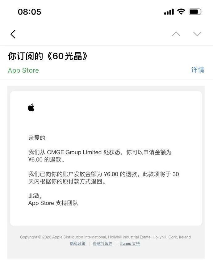 举例:如若App Store账号绑定邮箱有收到这条邮件提醒,即代表退款成功,大家可前往原支付账户查看~