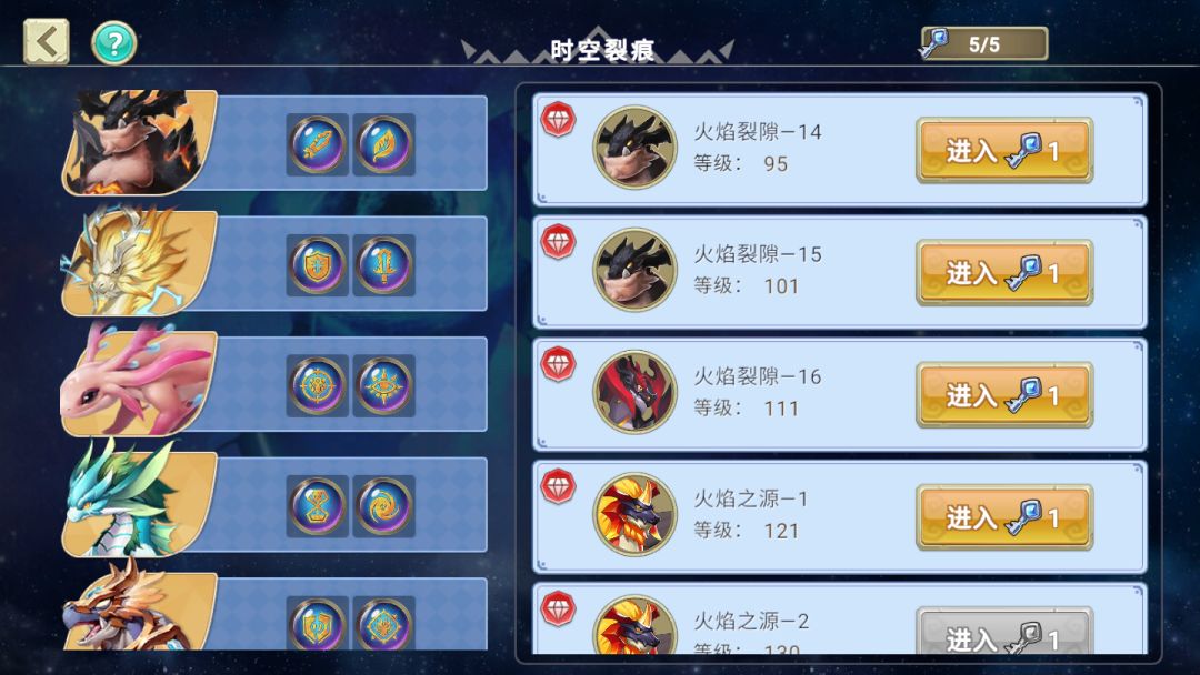当驯龙师们到达17级的时候就可以撕开时空裂痕,窥见这个世界不为人知的一部分。在这里,驯龙师们会在裂痕之中遇到强大的敌人,打败它们就可以拿到掉落的龙纹宝藏。时空裂痕被分为六种,每一种都有多层关卡,只有通过当前关卡才有开启下一层关卡的资格。而进入这里不仅需要驯龙师们拥有强劲的实力,同时也需要时空秘钥帮助开启。秘钥每十二小时恢复一次,最多累积到五次。当然喽,为了保护驯龙师不畏强敌的勇气,挑战失败是不会消耗秘钥的,请驯龙师们放心大胆的去挑战吧!