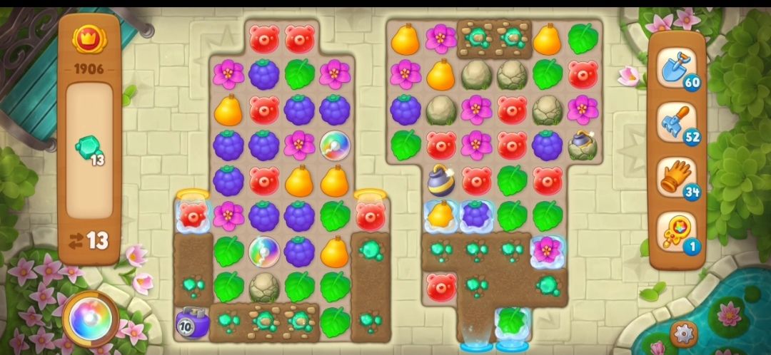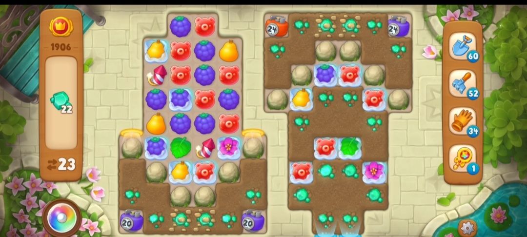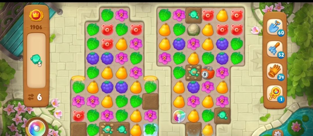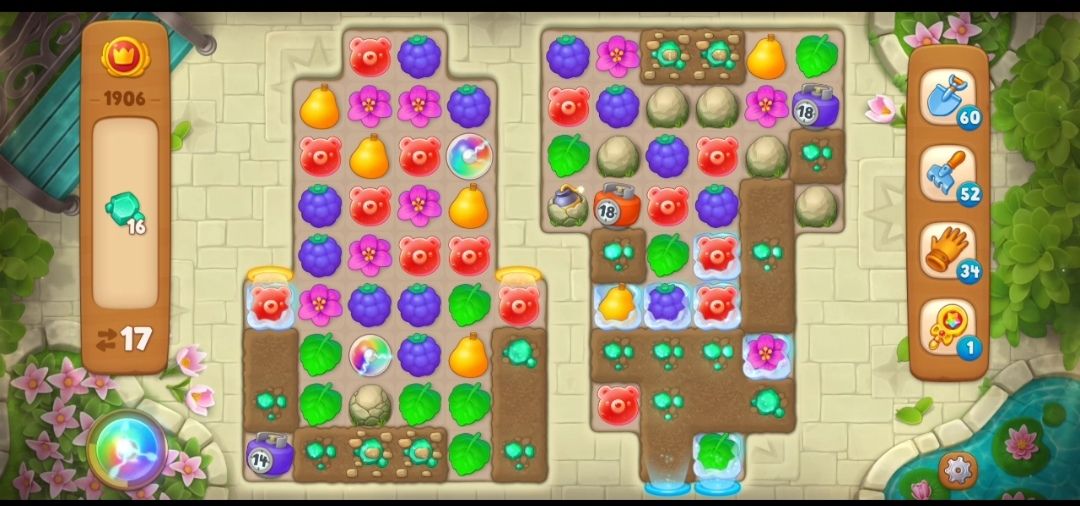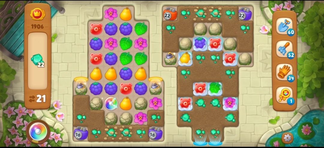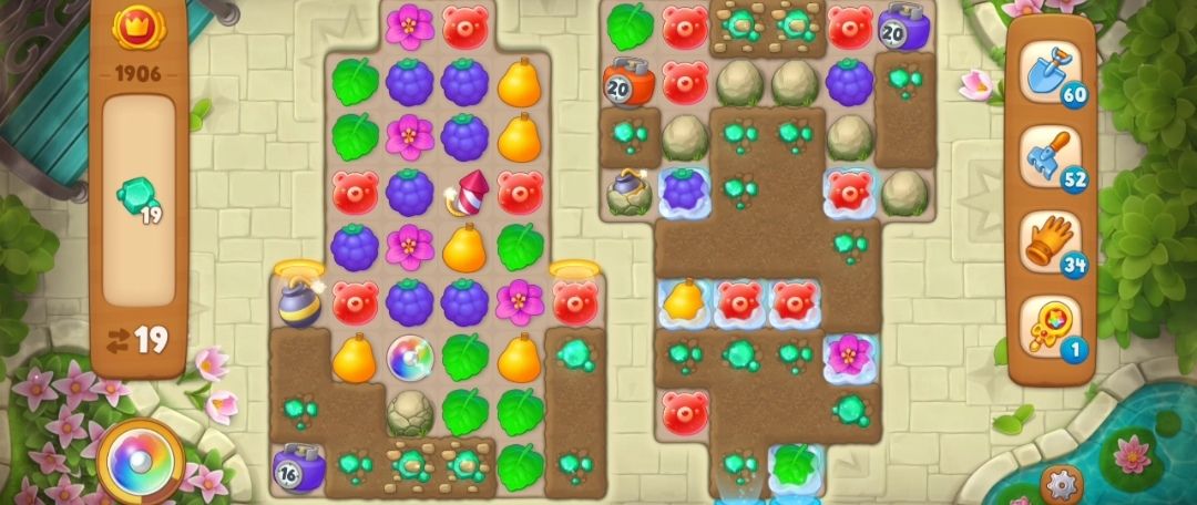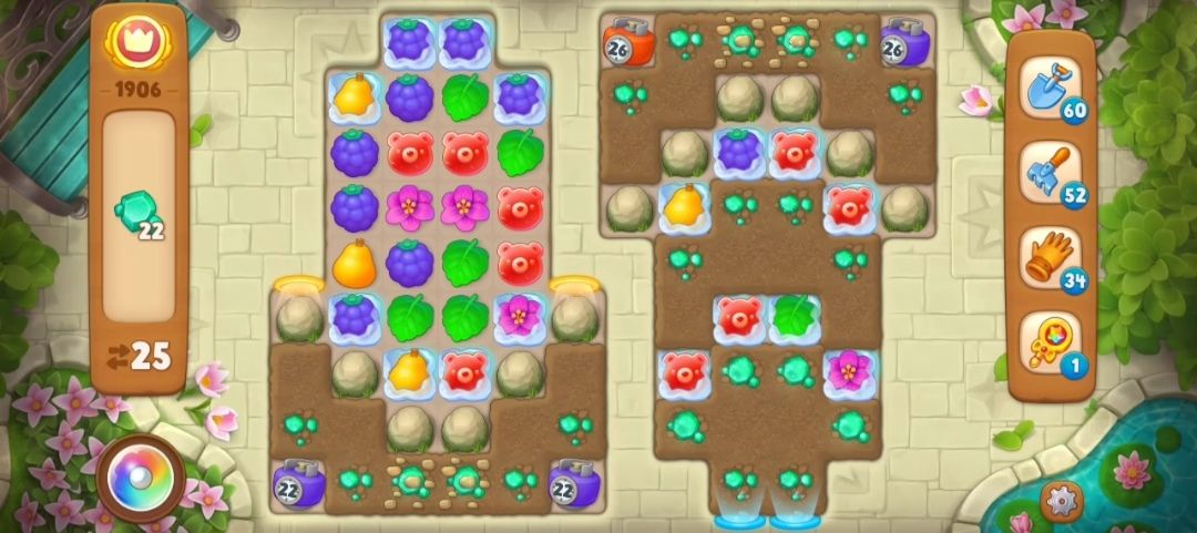 ⑤过关目标翡翠在土块里,消除土块才能收集翡翠这一关的土块有两种,一种就只是纯土块,只需要在土块旁边进行一次元素匹配就可以消除,一种是带小石子,需要两次元素匹配才可以消除但是土块被冰层和石头包围着,所以还是要消除冰层和石头,才可以消除土块。
