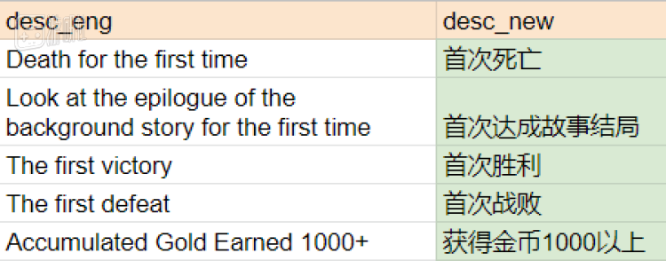 接下来是共享编辑,开发者通过邮件向我分享了一个谷歌文档,需要翻译的文本背景被标了浅绿色,每页的表格对应了不同的内容:物品,成就,属性,怪物,主线剧情,支线剧情,主线结局,支线结局,普通事件,战斗事件等等,每一项内容包含了几十到一千不等的待译条目。