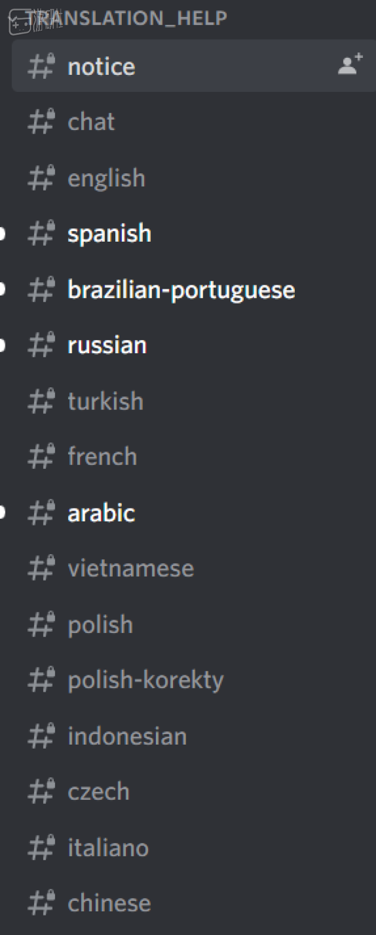我先是看了Discord的情况,如开发者所说,我的权限等级已经被设置成了Translator,可以看到普通频道成员看不到的翻译频道,里面已经有了十多个语种的子频道,用于该语种志愿翻译者沟通,不过没有看见中文的子频道。
