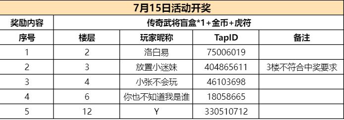开奖啦!恭喜“洛白易”、“放置小迷妹”等5位小伙伴获奖,请根据楼中楼的回复添加客服小姐姐的QQ,并提交活动链接、游戏昵称、游戏ID、Tap个人主页截图等信息兑奖~