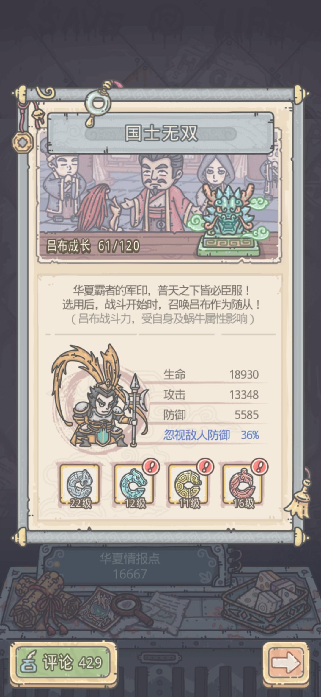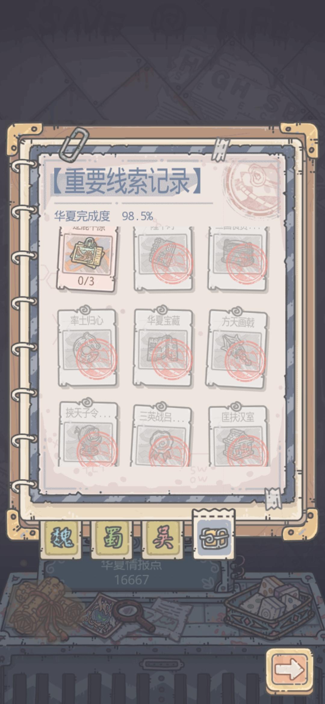 三卡党,华夏情报全部点满,情报点已经溢出了,探索98.5%,打不过最后一关的小BOSS吕布,英伦地图开不了......