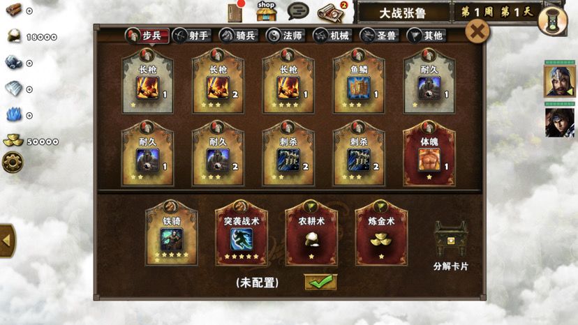 过完第五章,花费300金币开启第六章,相比之下第六章难度骤增,第一关大战张鲁没有具体的去打过,开图后就去挑战了,前面还好,由于好久没打这关,具体打法不太熟悉了,等到3周多资源只够升级98西凉铁骑,而且装备也不好,打了一个下午被张鲁狂虐,后来就放弃了,想着去兵临刷个八卦再来挑战,到今天才刷了50+碎片也没有开出装备,感觉今天能一洗前耻打败张鲁,所以没事的时候就过来又打了一次,没成想真过关了。 下面说说具体打法:这关的三星过关条件是3周6天内通关地图,并在挑战过程中获得7次三星战斗评价!战术卡使用铁骑、突袭战术,农耕术、炼金术,由于没有购买张合英雄令,所以只能使用夏侯渊去打杨昂,第一天张合把营地周围3队重骑兵招到队伍里,然后两个英雄都往右走,第二天继续往右走,第三天张合把骑兵全给夏侯渊分四组,注意刷战场没有建筑物,多试几次可以打败杨昂,夏侯渊差不多还剩100多重骑兵,张合从旁边山洞进去,第四天张合从右上角山洞进去从洞口出去对话曹操,免费获得12级司马懿英雄令(赶紧穿上装备),曹操对话司马懿、许褚加入队伍,曹操把队伍里虎豹骑分组,往上走去打杨任、百夫长,杨任比较好打,打百夫长的时候要注意了,百夫长有减伤光环(自己周围10格内友军受到伤害降低99%)所以要优先击杀百夫长、再打武当飞军,利用好虎豹骑的投枪技能触发司马懿的联动尽快击杀百夫长,后面的武当轻松灭掉,然后张合跟在曹操后面往上走,夏侯渊往左边山洞口移动,第五天张鲁开始散布言论,使得众多教徒出现抗击曹操(好卑鄙),曹操把神像旁边青龙打掉访问神像(如果曹操已经亮5技能,就选80移动点)往左走,张合去访问神像选择80移动点,夏侯渊从山洞进去过去虎豹骑那个山洞里面,第六天提示海上出现了几位幸存者,自身都难保了,不去管他们了,曹操把剩下的虎豹骑分组去打左边的道教徒,注意boss会放火,打掉道教徒后曹操、张合继续往左走,夏侯渊把虎豹骑洞里资源捡了,第七天曹操往左走访问帐篷回血并换上回蓝装备,过天后会有连续的战斗,张合从旁边山洞进去走到夏侯渊虎豹骑山洞里,都在里面停留不要出来,2周1系统提示营地被骑兵偷袭,曹操换好装备直接去打掉,总共三个骑兵统领,右边还有一个追击而来的道教徒也一起打掉,然后曹操换上跑路装,张合出去到集市把所有资源换成粮食,留下2000左右的金币就可以了,2周2曹操去访问帐篷回血,往右走,张合会被百夫长打掉,不管了后面用不到他了,2周3曹操从之前的山洞过去汇合夏侯渊,夏侯渊把骑兵全给曹操,2周4曹操出去往张鲁城池方向移动,夏侯渊也出去就待在洞口附近吸引敌人过来,曹操前面战斗的时候注意要打够7场三星战斗,2周5继续往张鲁旁边走,做好准备2周6开始攻城,把重骑兵最大化的升级西凉铁骑,剩下的重骑兵分3组,分2组一个骑兵,剩下的重骑兵集中一组,站位曹操、西凉铁骑、1重骑兵、1重骑兵、司马懿、重骑兵、许褚,这只是我个人的打法站位,也可以根据自己的装备情况去调整,装备实在太差,曹操、司马懿太脆了,碰一下就死,所以需要刷开局,对面兵不打曹操司马懿,并且散仙不定身、堵路西凉铁骑,第一回合曹操传西凉铁骑进城在左边挨着朱雀,由于司马懿腿短,第一回合只能用普攻往前走打人,许褚当肉盾吸引伤害吧,西凉铁骑跑起来打对面红法,直接灭两队,注意看头上有炸弹的单位要距离其他友军2格以上距离,然后第二回合西凉铁骑灭散仙打被张鲁释放护盾的敌方单位,要利用好西凉铁骑的特性,跑起来打,出现连击的几率很大,伤害很高,打完散仙清朱雀,最后集火打张鲁,打张鲁的时候要注意每回合造成的伤害不能超过2800,不然会触发反馈之光全屏伤害,后面根据张鲁受到的伤害会召唤出鹰卫和法师,逐一清掉、慢慢磨血,胜利总归是我们的,刷了多次开局终于打败张鲁,三星过关!附图,由于装备不好,很多战斗需要刷开局、很麻烦,所以就没有录视频,以后有机会再补录,另外说一下摸金校尉任务的完成方法:开局对话营地旁边的npc会减少10000金钱,后面找机会对话码头旁边的npc给他50000金钱可以买一把洛阳铲,然后从杨昂寨子左边洞口进去在中间黄色的地方停留,便可以完成任务
