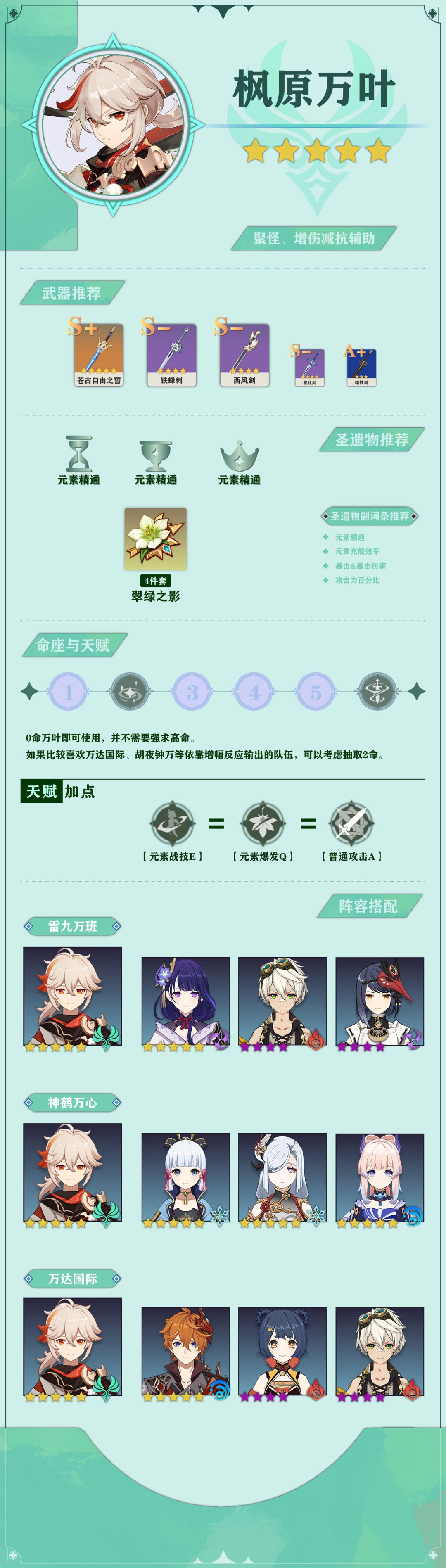 五.阵容搭配万叶的阵容搭配实在是太多了,基本只要是以火雷冰水属性作为主C的队伍,都可以选择携带万叶作为辅助。因此以下仅介绍一些比较热门强势的阵容。
