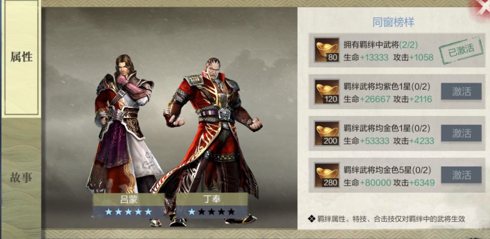 目前版本丁奉的武将羁绊较少,只有和吕蒙的一组【同窗榜样】羁绊,能够提升攻击力与生命值,增强身板和输出能力。