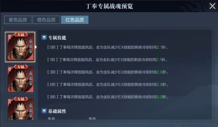 丁奉的专属战魂以EX攻击与旋风的联动为主,能够增加自身伤害,缩减全队EX攻击冷却。