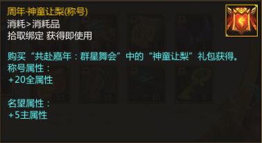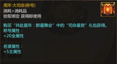 获取方式:共赴嘉年—群星舞会,仙术师分别购买三大周年礼后即可获得同名周年称号