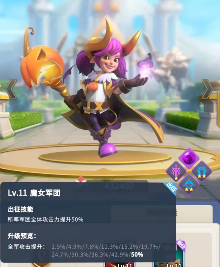 1、小魔女,魔女军团能够提升全体士兵攻击。