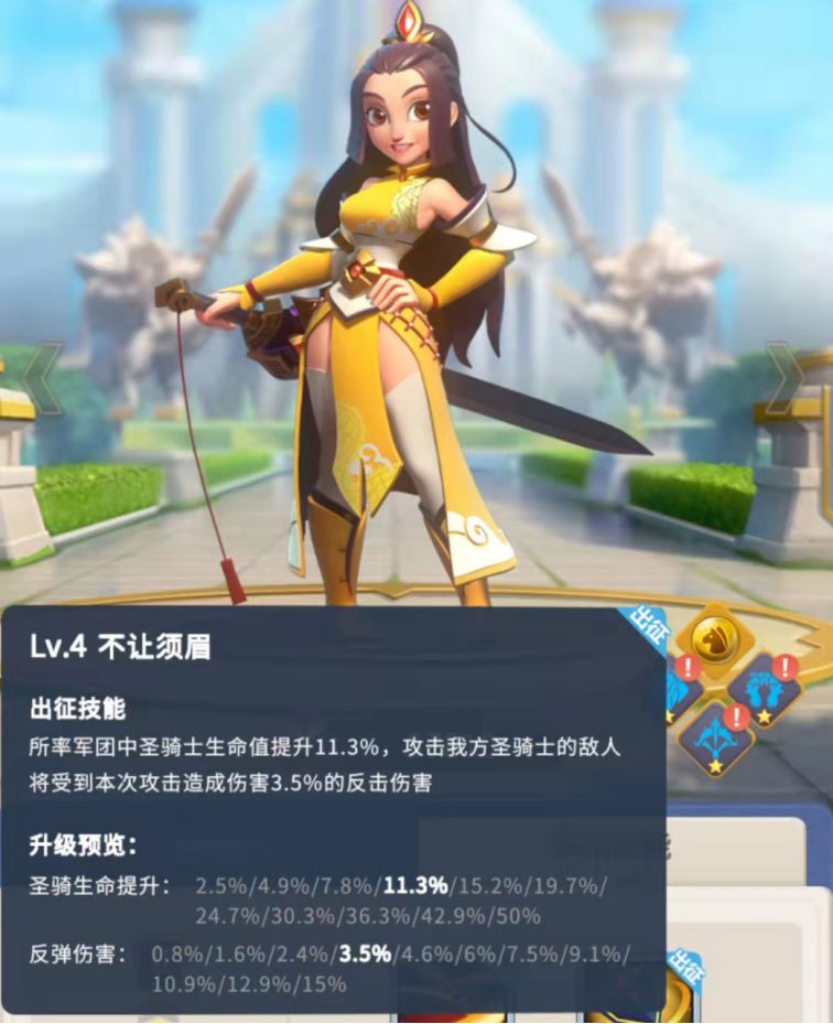 这五名英雄都能影响所有士兵,因此用作守城英雄再合适不过,如果缺少其中某个英雄,大家可以上阵一个主力军团阵容加成最高的英雄,比如你是玩弓兵,那就上一个南蛮之王或者绿林游侠,要是没有更好的选择,上明珠公主也不错,毕竟守城期间圣骑士依然是前排保障,加上她赋予圣骑士的反击也能给对面造成不错的伤害。