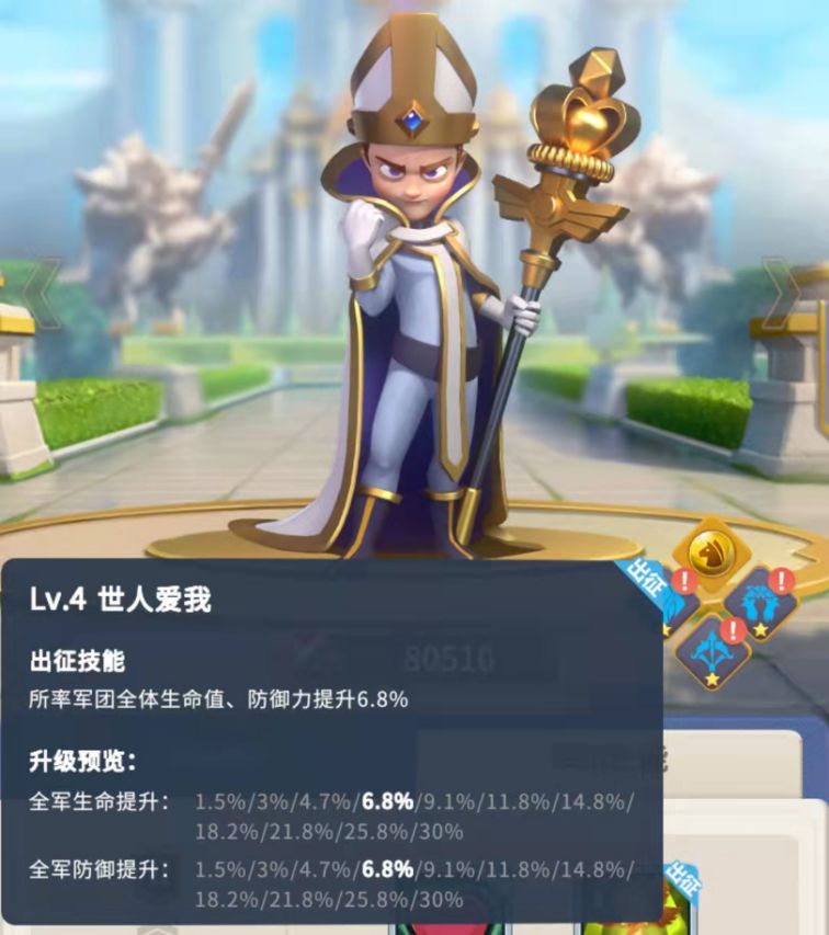 守城不等于出征,不是只针对那一队主力士兵,守城阵容所统领的是整个领地的所有士兵,因此当你其他兵种的数量与主力相仿时,再用主力军团阵容加强单一兵种属性就不合适了,那些能够影响全体士兵属性的英雄性价比才更高。