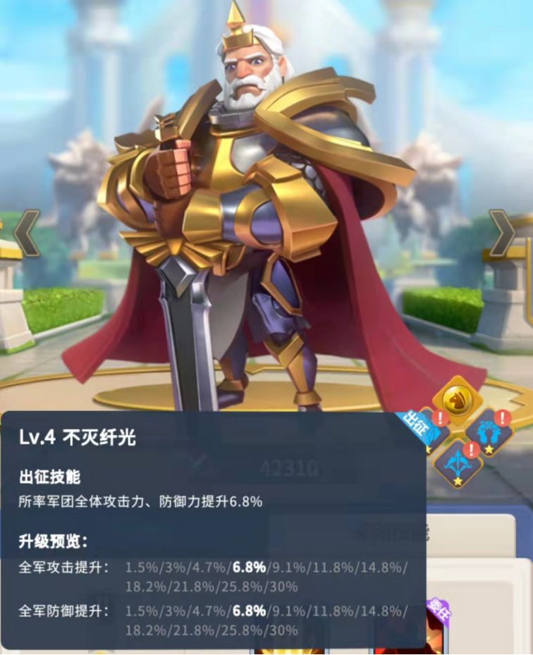 2、光明统帅,不灭纤光能够提升全体士兵攻击力、防御力。