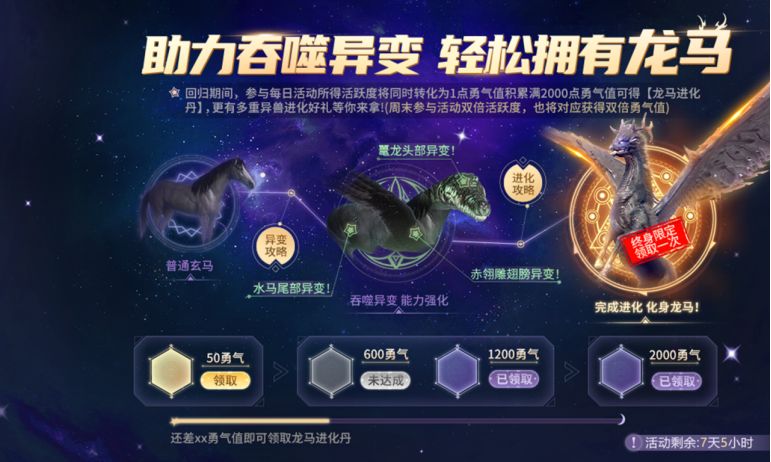 3.宠物养成助力礼:完成日常任务积攒勇气值,就能白嫖包括龙马进化丹在内的全部龙马进化材料~