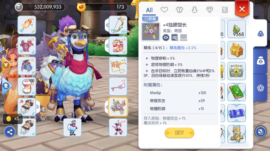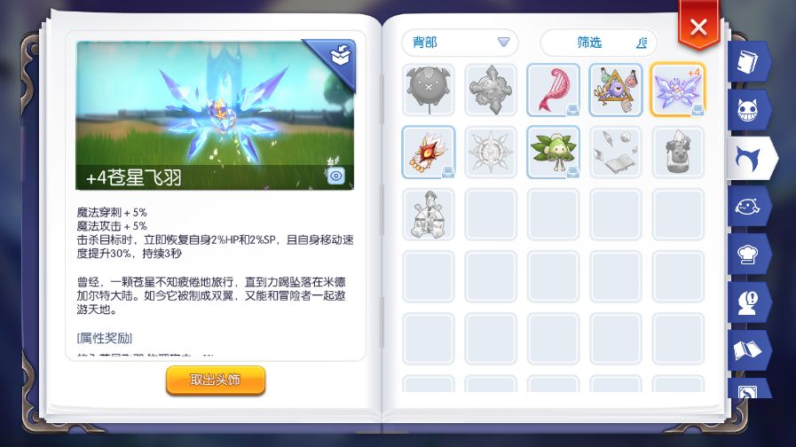 而要保持自身SP在一定程度,馆长背或者苍星背必不可少。经实测,装备了馆长背以后开星辉挂机,SP量基本能保持的80%左右,按2000蓝量来说就是1600攻击,SP6000的话,就是4800攻击。