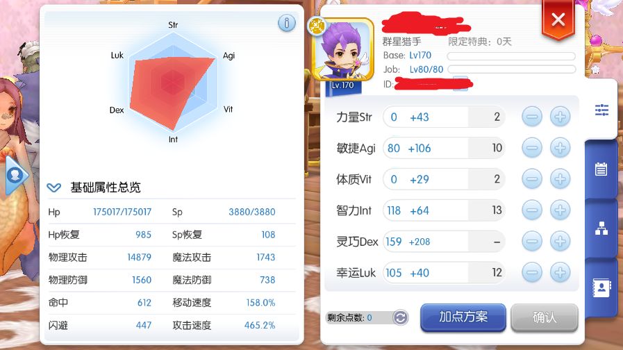 关于加点,原来ADL(即以普攻暴击为攻击手段的挂机猎人)加点,一般是A+到满攻速,D159,L+到满暴击,之后剩下的点数根据自己尾巴用的绒绒或者风歌牧犬或者锦宝来分配。