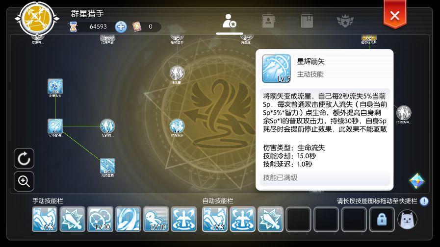 7月13日的新版对猎人的星辉箭矢进行了改动,增加了剩余SP*1的普攻伤害。经过测试,这次改动使原本几乎只能用于PVP的星辉技能升级成了一个非常不错的挂机技能。尤其对萌新来说,能够极大的降低挂机门槛。