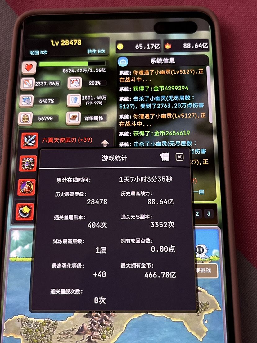 玩了快一周了,终于过半了,强化+40真是折麽人,我用钛备份大法,基本上是2分钟5次的速度,有的时候十分钟一级都上不去,到2W多级的装备,39+40要140亿金币,金币永远都不够