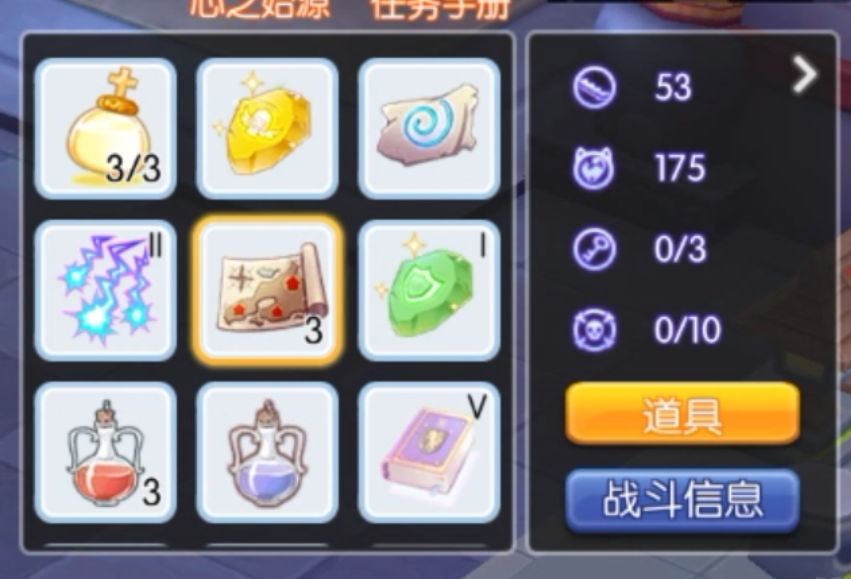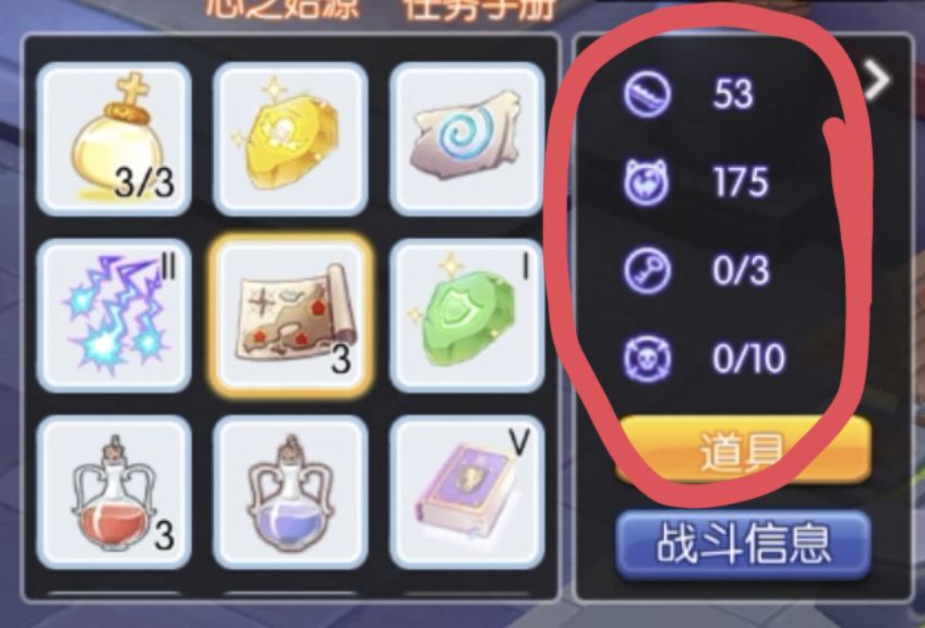 道具图标右下角的阿拉伯数字代表数量,最大堆叠数量为10(一般也就红蓝药能堆到这个程度),点一下用一个少一个,谨慎点击