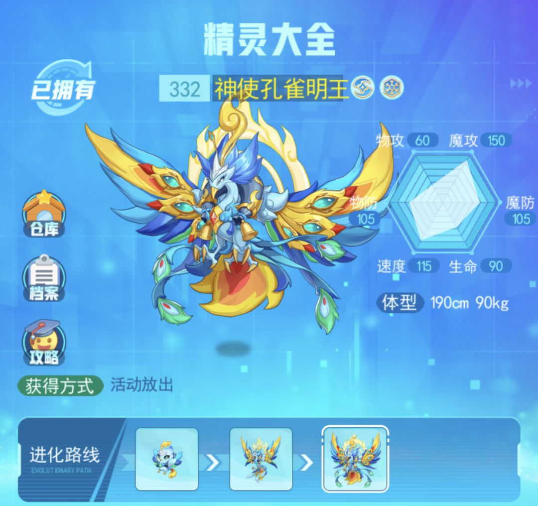 而且,重点来了,具体看一下孔雀的各项种族分布,双防都在100以上,可以说绝对不算脆皮,法攻150是啥概念呢,我就这么说,全手表目前最高的法攻种族,没有之一,另外速度115,几乎比99%的主流精灵都要快,擂台上热门宠比这个速度种族高的只能说屈指可数,而且主流的输出宠快过这个速度的,也仅有霹雳虎它的闪光态这两个,只能用恐怖来形容,又快伤害又高,如果不是生命略低,这种族值真的也就完美了。