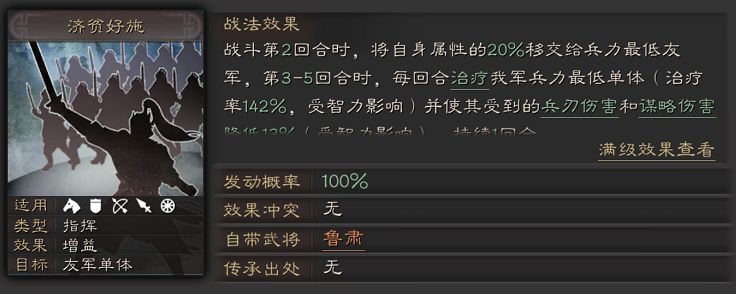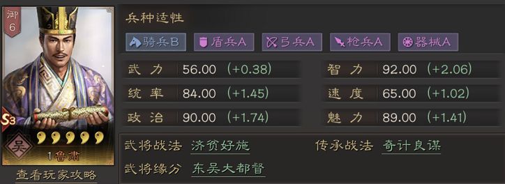 为什么说鲁肃是一名很强的辅助武将呢?首先鲁肃的兵种适配性还是很不错的,虽然没有哪个属性特别拔尖,但基本上都是A级,作为副将也是足够的了。其次,鲁肃自带的战法济贫好施能够在战斗的第二回合将自身属性的20%转移给兵力最低的队友,直接为队友的输出进行了加成。而且之后的回合还能对自己的友军进行治疗的效果。