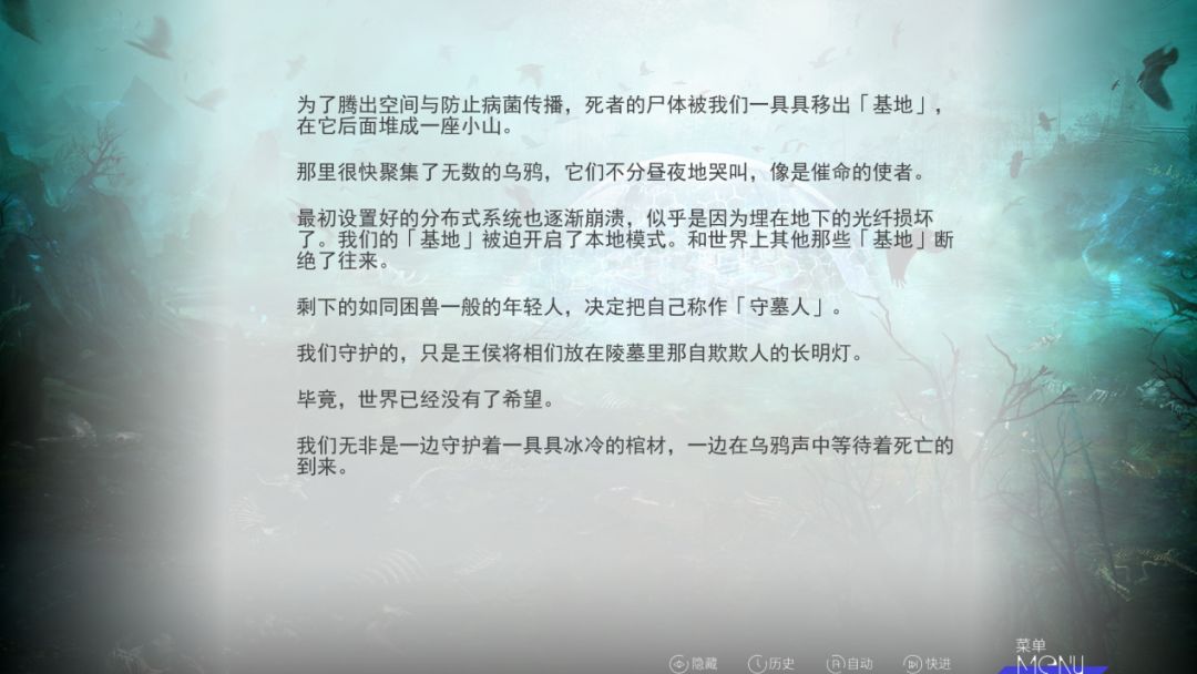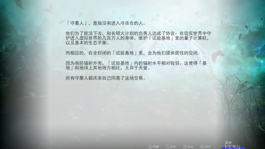 在游戏传达的内容上,虽然前路像《行路难》那般坎坷,但主角也并未放弃所有的希望,而是以自己的努力,成功回到现实世界。这也让本该可能耽于情爱的Gal元素,转变成了为人类希望而战的使命感。在处理主角的转变方式上,这款游戏也并未显得突兀,而是采用了冷冻仓和虚拟意识的几百万人的“试验基地”,以及动漫《银之守墓人》、《神墓》这类小说漫画的设计,打造了末世绿洲守卫般的“守墓人”角色,他们在外围看守已经进入“新世界”的人的肉体,躲避核能泄露带来的危害。